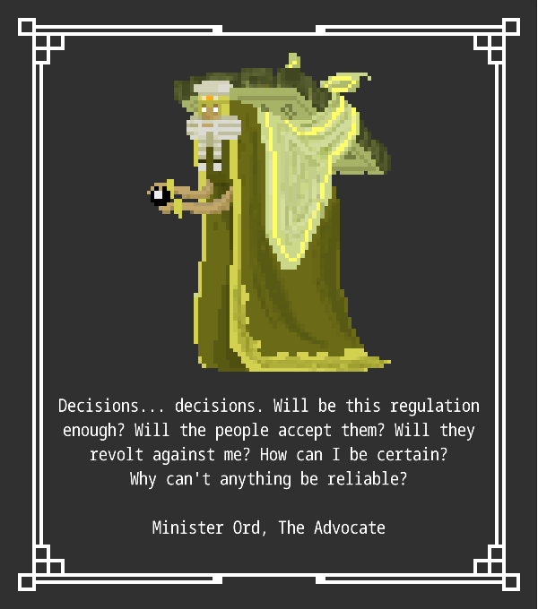 Decisions... decisions. Will be this regulation enough? Will the people accept them? Will they revolt against me? How can I be certain? Why can't anything be reliable?