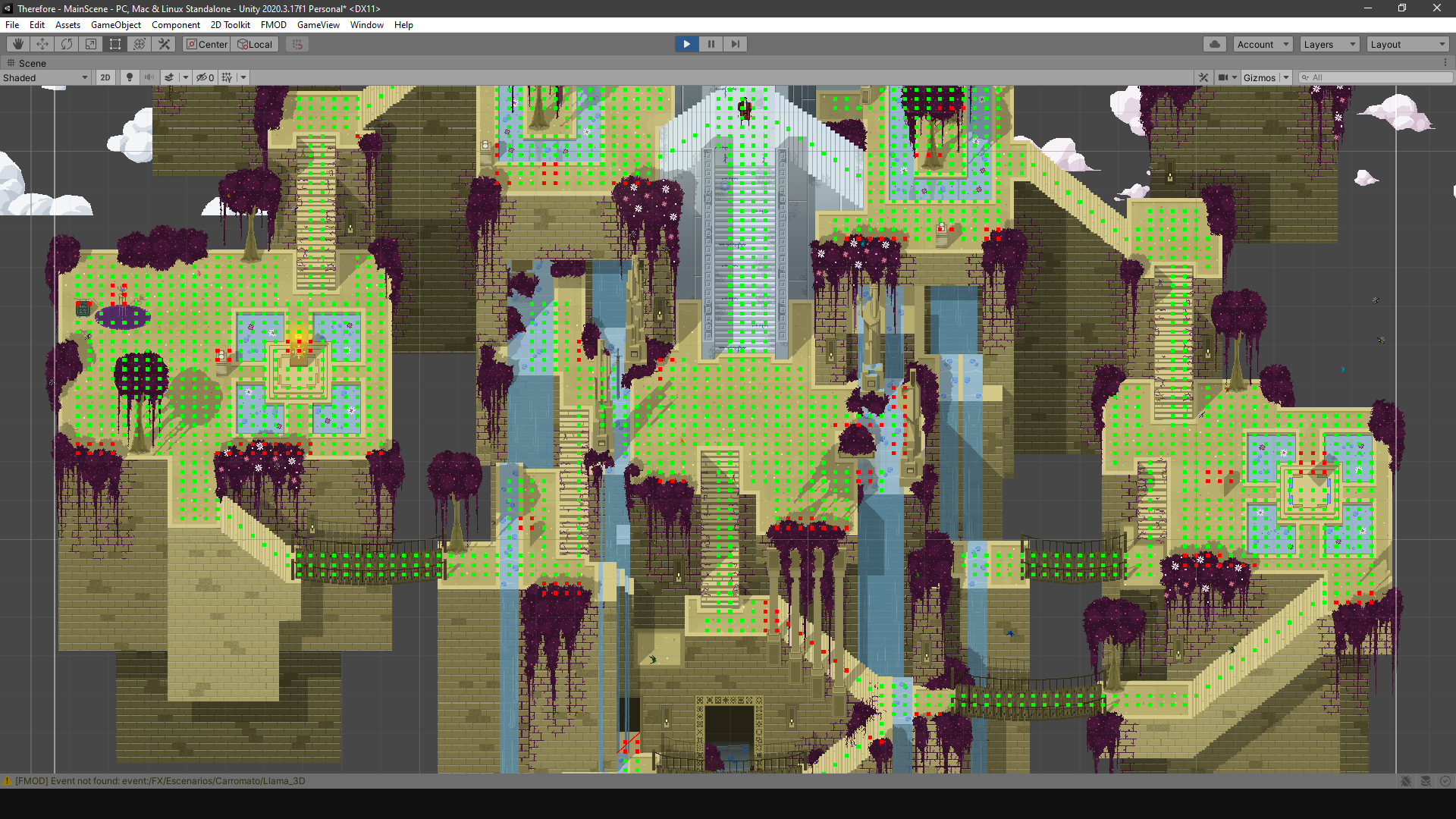 2) Capa de pathfinding: es una rejilla de puntos sobre el área transitable que se usa con el algoritmo de pathfinding A* (A estrella). Esta rejilla se genera automáticamente a partir de la capa de navegación 1).