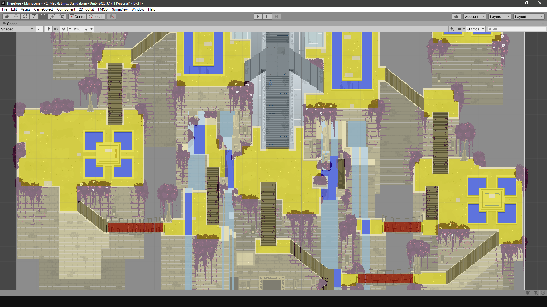 1) Capa de navegación: es una imagen que indica por qué partes del escenario se puede caminar. Cada color indica un tipo de terreno para automáticamente asignarle un efecto visual y sonoro de pasos para cualquier personaje. Aquí el amarillo indica arena, el azul agua, el rojo madera y el negro piedra.