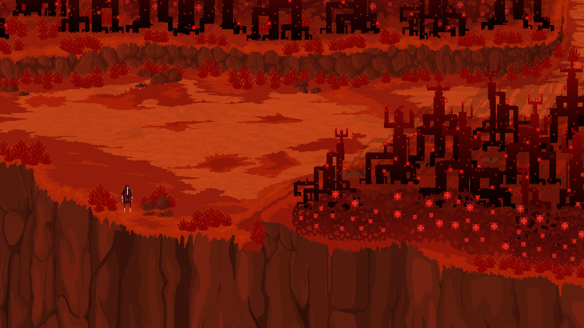 The woodlands, created by the Dawn Prince, are an amalgam of throbbing and tangled vegetation always in fire, irrigated by the great Willow's sap, as if it was a cardiovascular system. This scenery is at an early stage right now, details, objects and effects are pending.